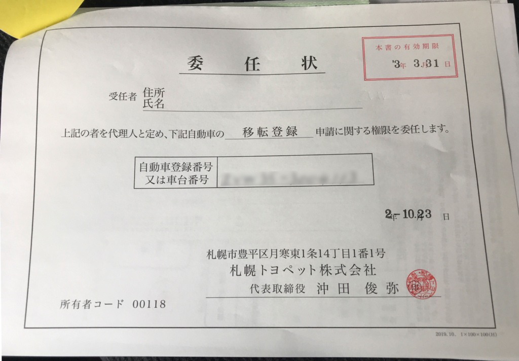 車検種の所有者から「申請依頼書」に印鑑(認印で大丈夫)住民票の写し(発行から3ヶ月以内)が必要になります。